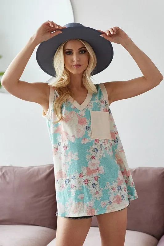 The multi-color flower printed tank with contrast band is a vibrant and stylish choice for your summer wardrobe. The flower print adds a fun and colorful touch to the tank top. The contrast band detail gives it a modern and eye-catching look. Perfect for warm days, this tank top is versatile and easy to pair with shorts or jeans. Elevate your casual outfit with this chic and playful tank top that exudes a fresh and summery vibe.