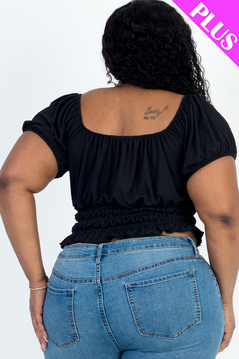 Plus Size Casual Ruched Puff Sleeve Ribbed Knit Solid Top (CAPELLA)