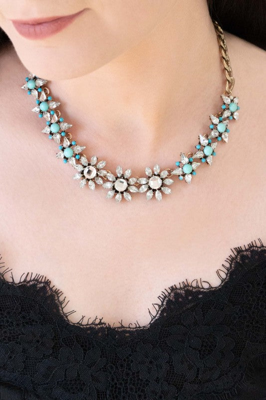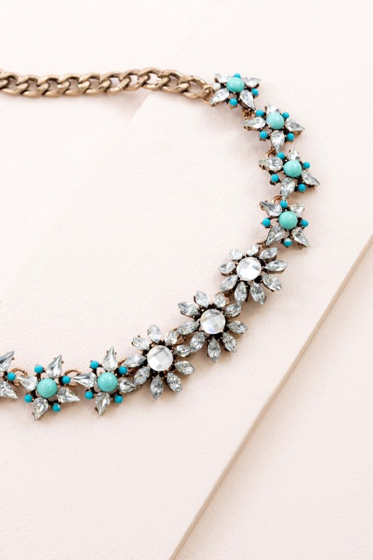 Line your neck with beautiful crystal and cabochon turquoise stone accents. A bold statement without the bulk.