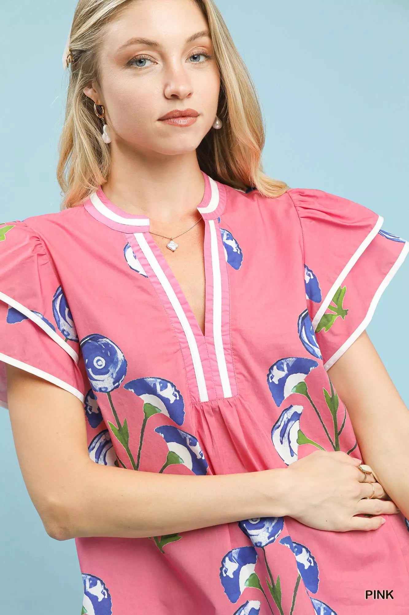 Umgee Blossom Meadow Print Blouse with Contrast Trim