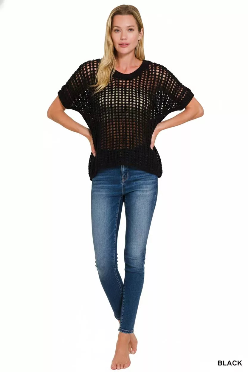 Zenana Fish Net Short Sleeve Crochet Knit Cover Up