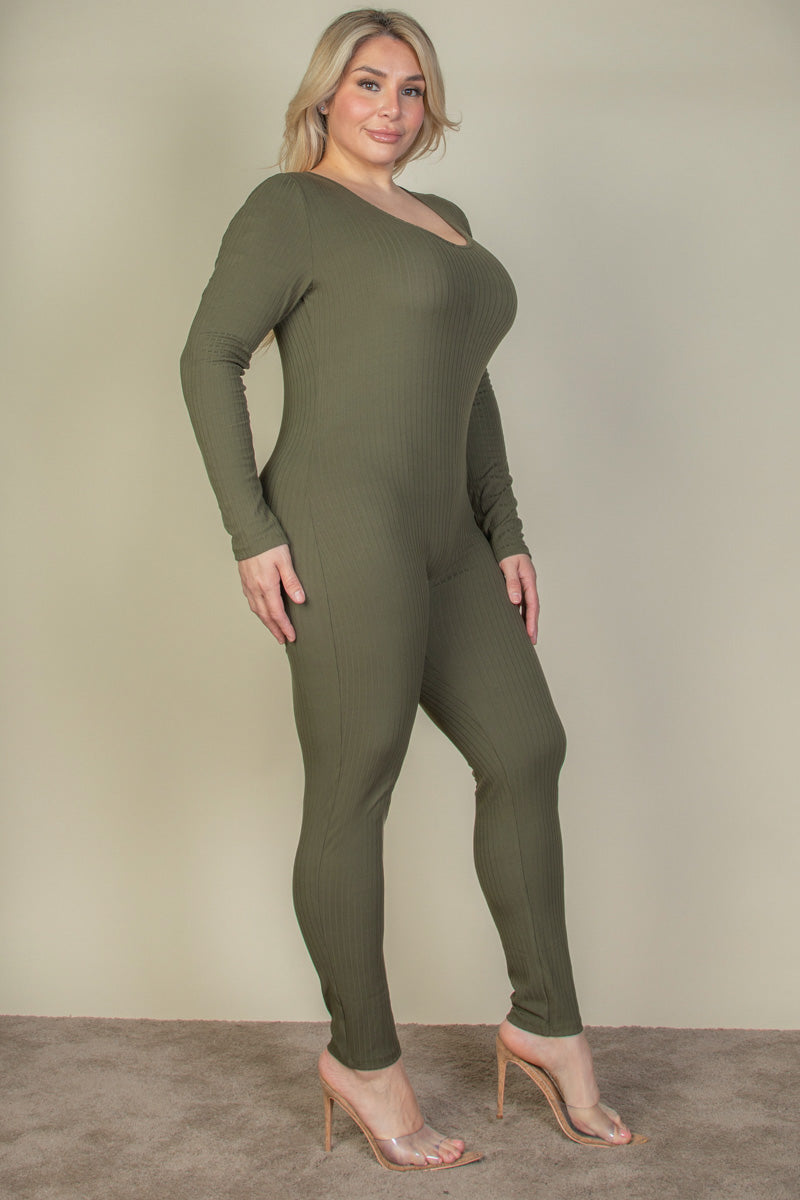 Flatter your curves with this plus-size ribbed long-sleeve jumpsuit designed for confidence and comfort. Crafted with a soft, ribbed knit fabric that moves with you, this sleek one-piece offers a figure-enhancing fit without compromising on ease. The classic scoop neckline and full-length design make it a perfect base layer or a standout piece on its own. Pair it with your favorite accessories and shoes for a stylish, effortless look.