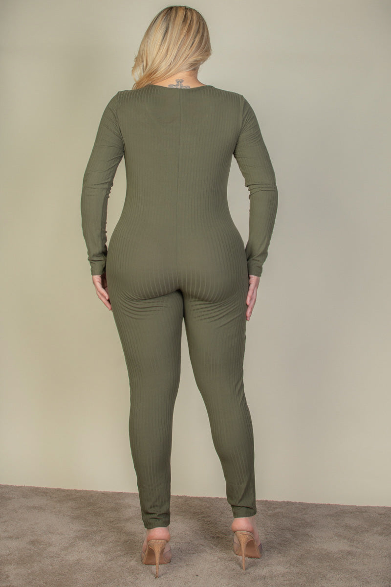 plus-size jumpsuit, ribbed romper, curve-hugging jumpsuit, long-sleeve bodysuit, trendy plus-size fashion, comfortable chic, stylish plus-size jumpsuit, elevated basics